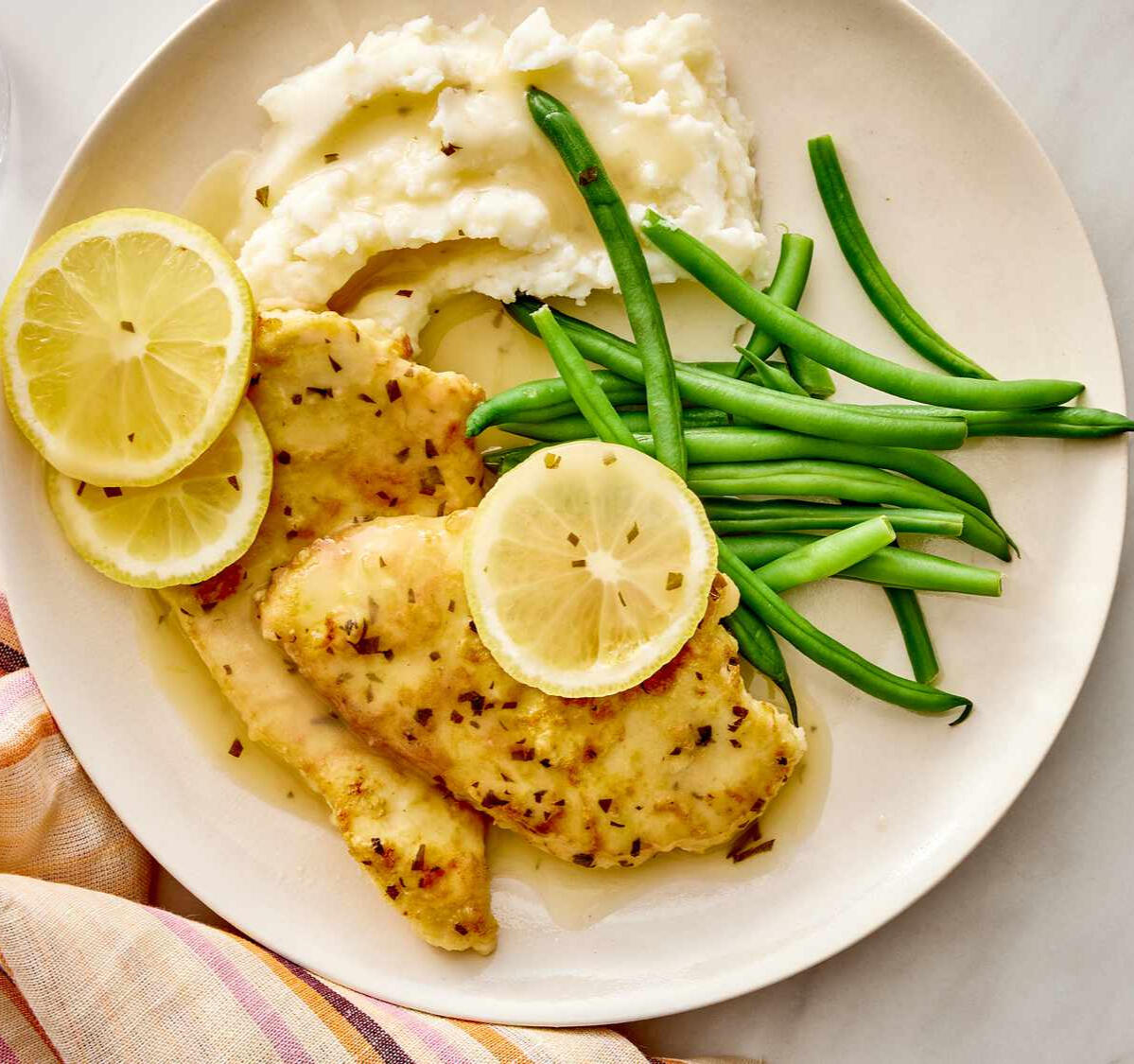 Lightly battered chicken cutlets are pan-fried until golden, then finished in a bright lemon-butter sauce with garlic and white wine. Delicate, zesty, and elegantly savory, each bite offers tender chicken coated in a silky, citrus-kissed glaze.