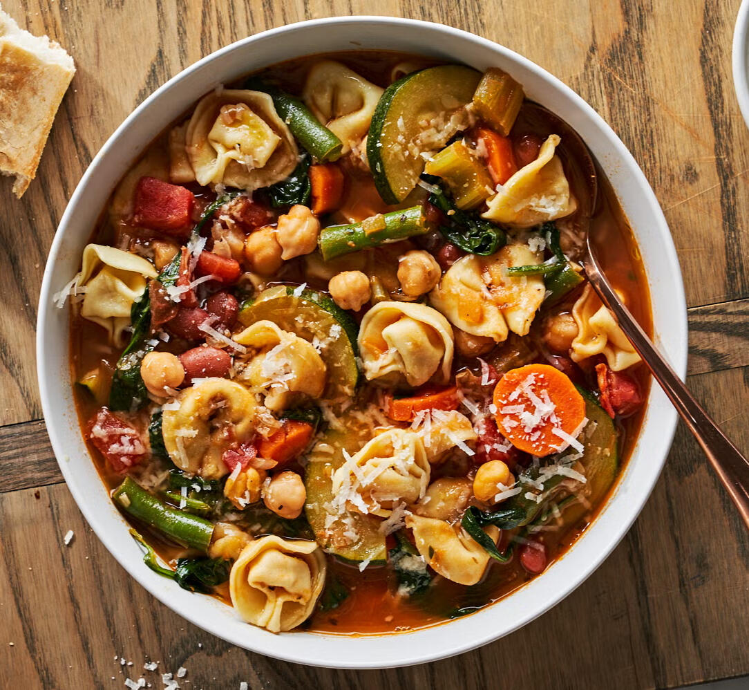 Hearty cheese tortellini simmered in a creamy tomato broth with tender vegetables, beans, garlic, and fresh herbs. Rich, comforting, and full of rustic flavor, each spoonful blends silky pasta with savory depth and a touch of velvety indulgence.