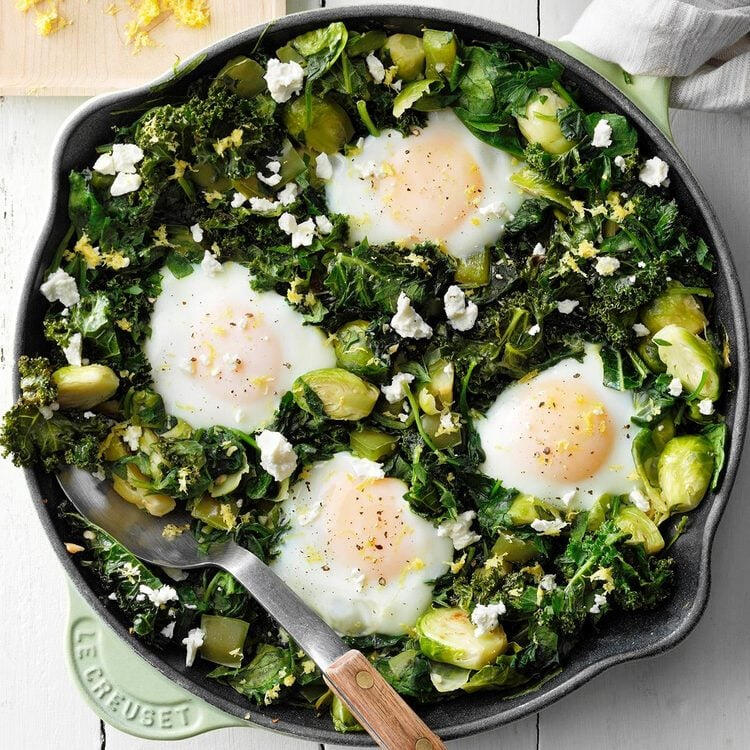 Eggs gently poached in a vibrant, herb-packed skillet with spinach, kale, and fresh greens, garlic, onions, and warm spices. Bright, savory, and deeply comforting, this rustic dish delivers silky yolks and fragrant, garden-fresh flavor in every bite.